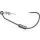 Medium gape, forged carbon steel hooks with easy clip-on large eye and mounted stainless steel centerpin corkscrew. Ultra-sharp needle point with micro barb.
